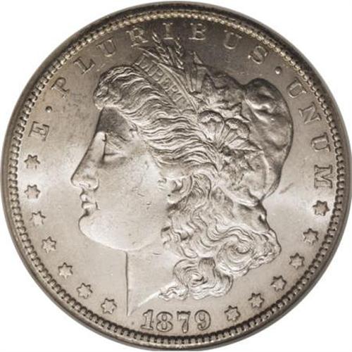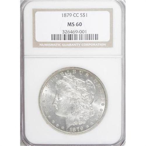 <B>1879-CC $1 MS60 NGC.</B></I> Whispers of light tan-gold color hug the rims of this Carson City issue, framing the color-free centers. The design elements are generally well impressed, though minor softness is apparent in the hair over Liberty's ear. Minute marks and luster grazes are scattered over lustrous surfaces. Actually, a nice coin for the grade designation. David Bowers (2006) writes: "In any grade, the 1879-CC is highly desired, and stands 2nd only to the 1889-CC in terms of rarity among Carson City issues."<BR><BR><b>Shipping:</b> Coins & Currency (<a target="_blank" href="http://www.heritageauctions.com/common/shipping.php">view shipping information</a>)