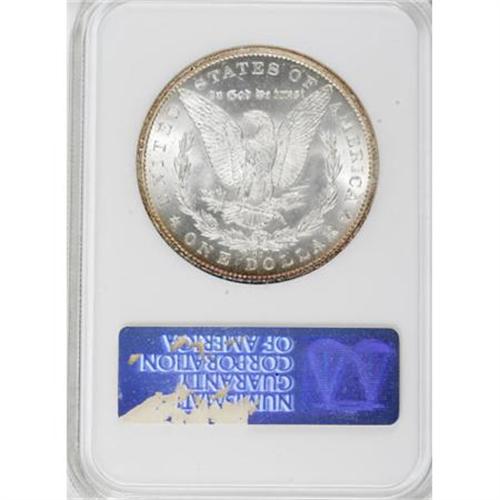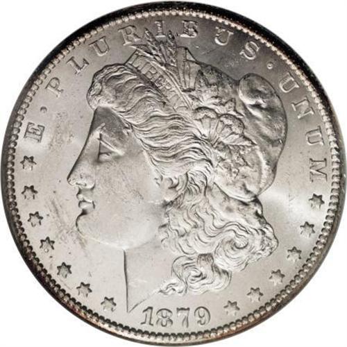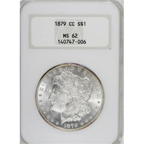 <B>1879-CC $1 MS62 NGC.</B></I> This lustrous and suitably struck key date Carson City dollar is primarily brilliant, although the margins have blushes of apricot toning. The left obverse is typically abraded, but the remainder of the coin is well preserved. Housed in a prior generation holder.<BR><BR><B>Coin Engraver:</B> George T. Morgan<BR><BR><b>Shipping:</b> Coins & Currency (<a target="_blank" href="http://www.heritageauctions.com/common/shipping.php">view shipping information</a>)