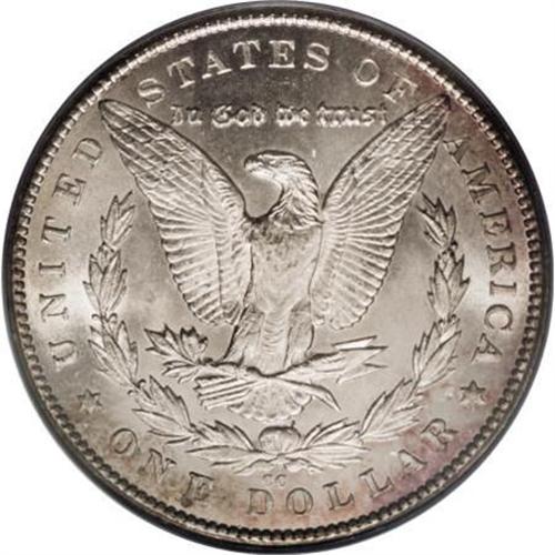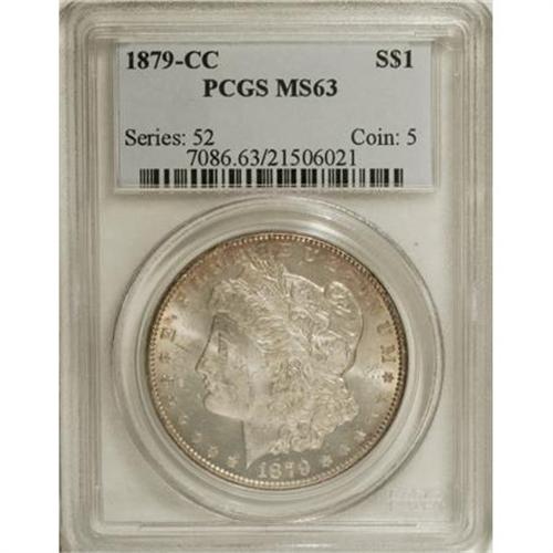 <B>1879-CC $1 MS63 PCGS.</B></I> Clear CC mintmark. Honey-gold and salmon-pink patina visits the borders, while the fields and devices are virtually untoned. Nicely struck and lustrous with an unabraded reverse and a few faint grazes on the cheek. Among the keys to a Carson City Morgan dollar collection.<BR><BR><b>Shipping:</b> Coins & Currency (<a target="_blank" href="http://www.heritageauctions.com/common/shipping.php">view shipping information</a>)