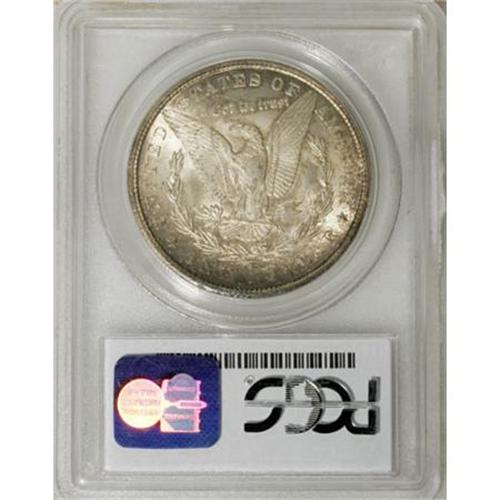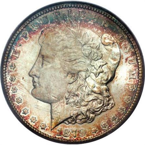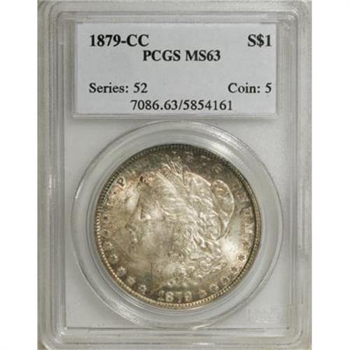 <B>1879-CC $1 MS63 PCGS.</B></I> The 1879-CC is a semi-key in the Morgan series with only 756,000 pieces struck, hundreds of thousands of which were probably melted under the 1918 Pittman Act (David Bowers, 2006). This Select example displays splashes of golden-tan and ocean-green color at the borders, and is well defined, except for softness in the hair at the ear. Lustrous surfaces reveal a few obverse contact marks.<BR><BR><B>Coin Engraver:</B> George T. Morgan<BR><BR><b>Shipping:</b> Coins & Currency (<a target="_blank" href="http://www.heritageauctions.com/common/shipping.php">view shipping information</a>)