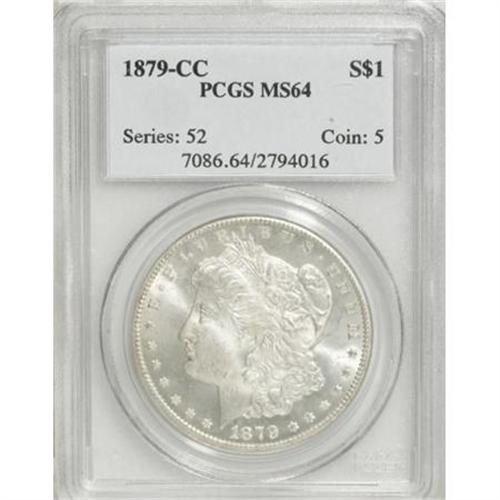 <B>1879-CC $1 MS64 PCGS.</B></I> A splendid, high-end near-Gem with semi-reflective fields and nicely frosted devices. The strike, while not entirely full at the centers, is certainly bold and the surfaces possess a very light silver-pink tone to them. A pleasing survivor from a low mintage of just 756,000 pieces. The reason for this low mintage (according to Bowers) is that confiscatory tariffs by the railroads made it cheaper to send Comstock silver hundreds of miles to the San Francisco Mint to be turned into coins rather than send it 15 miles to the Carson City Mint.<BR><I>From The Motor City Collection.</B></I><BR><BR><B>Coin Engraver:</B> George T. Morgan<BR><BR><b>Shipping:</b> Coins & Currency (<a target="_blank" href="http://www.heritageauctions.com/common/shipping.php">view shipping information</a>)
