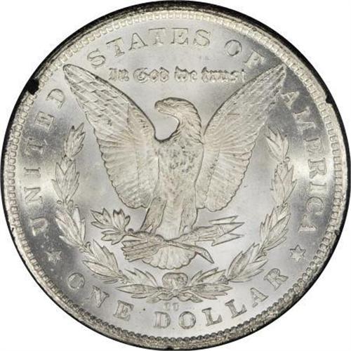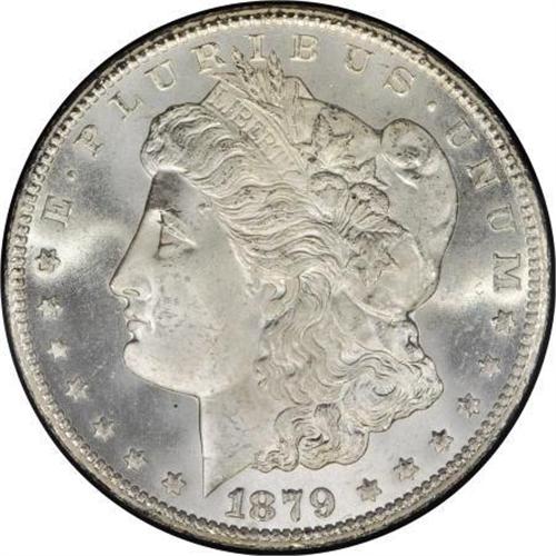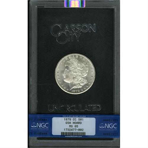 <B>1879-CC $1 MS65 NGC.</B></I> Ex: GSA Hoard. The Carson City Mint coined Morgan silver dollars from 1878 through 1893, with the exception of 1886, 1887, and 1888. Of the 13 coin series, just two dates are major rarities in Mint State grades: 1879-CC and 1889-CC. Some other issues are rare and desirable, but no others are equal to the two rarities.<BR> Most CC-Mint dollars never released, but rather stored in Mint or Treasury Vaults for many years to come. Finally, in the 1970s, the government realized that they could actually sell these coins to collectors and others, they received a windfall. The most common dates were 1878-CC and 1880-CC through 1885-CC. The remaining dates were represented by much smaller quantities, creating a windfall for those few collectors who received dates in the 1890's, or the 1879-CC.<BR> This example is fully brilliant with amazing silver luster and frosty mint surfaces. The strike is full and complete, and the surfaces are free of all but the tiniest abrasions. It looks more like a coin that was acquired directly from the Mint in 1879 and preserved by a knowledgeable numismatist, rather than tossed around with all the others in a canvas sack containing 1,000 such coins.<BR> It is amazing that any Morgan dollars distributed by the GSA could survive so fine when the "life" of these dollars is considered. After they were struck in 1879, they were placed in canvas bags containing 1,000 coins, and stored in vaults at the Carson City Mint. Every year, the bags were handled as annual inventories were completed. Then they had to be transported across country to the Treasury in Washington, D.C. Such transportation was probably by rail, and there is little doubt that the coins inside the bags were jostled about during the trip. After they arrived in Washington, the bags were again handled as they were moved into storage in Treasury vaults, and finally, they received further handling each year during Treasury audits. It surprises us that any could exist in better than MS60 grade. Census: 3 in 65 GSA, 0 finer (12/07).<BR><BR><B>Coin Engraver:</B> George T. Morgan<BR><BR><b>Shipping:</b> Coins & Currency (<a target="_blank" href="http://www.heritageauctions.com/common/shipping.php">view shipping information</a>)
