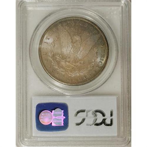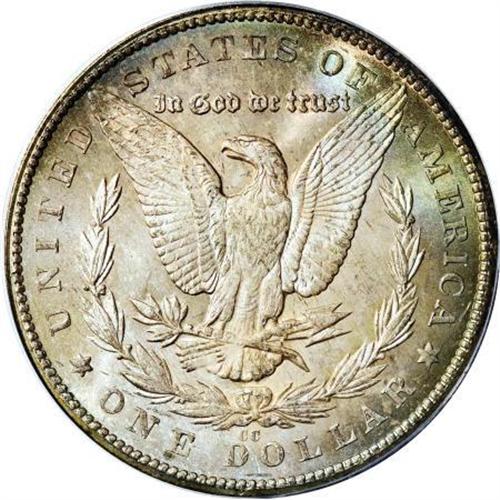 <B>1879-CC $1 MS65 PCGS.</B></I> Stunning light pastel toning on both sides in shades of ice-blue and rose greets the viewer of this MS65 specimen, with a dab of lime-green on the reverse border. Considerable quantities of luster radiate from beneath. Liberty's cheek is quite clean for the grade designation, as are the remainder of the surfaces, although some undistracting nicks are noted just above the date. The strike is sharp in mostly areas. This Large CC variety, with the perfect mintmark, is more popular than the Large CC over Small CC variety. Gems of this issue are highly elusive, as the population data attest: this delectable coin is among the 80 Gems so graded at PCGS, surpassed by only two pieces at that service, and none at NGC (6/07).<BR><BR><B>Coin Engraver:</B> George T. Morgan<BR><BR><b>Shipping:</b> Coins & Currency (<a target="_blank" href="http://www.heritageauctions.com/common/shipping.php">view shipping information</a>\)