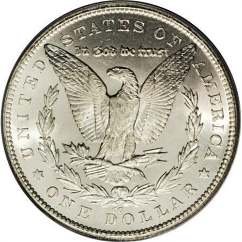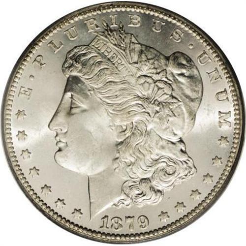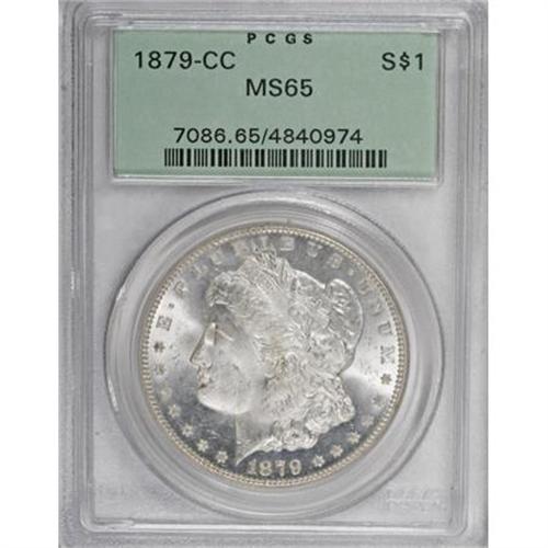 <B>1879-CC $1 MS65 PCGS.</B></I> Normal Mintmark. After the healthy mintage of more than 2.2 million Carson City Morgan dollars in their premiere year, in 1879 the mintage dwindled to just 756,000 pieces, split about 60:40 between the Perfect Mintmark, or Large CC, and the so-called "Capped Die" mintmark varieties. While the Perfect Mintmark is slightly more available, it is also more popular than the Capped Die variety. The latter is also known as the Large CC Over Small CC variety.<BR> At one time the 1879-CC was considered less scarce than either the 1881-CC or 1885-CC dollars, but that changed in 1964 when it was discovered that the Treasury releases contained only 4,123 examples of the 1879-CC in that horde. The GSA populations for the 1881-CC and 1885-CC, respectively, were 147,485 and 148,285 coins, or about one-half and two-thirds of the respective original mintages (Goe, <I>The Mint on Carson Street</B></I>)! Further negative impact on the availability of the '79-CC dollar was caused by the generally accepted belief that huge quantities were melted as the direct result of the Pittman Act of 1918. And, even though roughly 5,000 examples have survived in Mint State grades, only approximately 200 or less can be considered Gem or better, according to Dave Bowers in his <I>Guide Book of Morgan Silver Dollars </B></I>(2007). Once considered common, the 1879-CC dollar was treated as bullion and handled with little care through the years. The heft of a silver dollar resulted in many abrasions and ticks, sometimes severe, as these coins were thrown into canvas bags and wantonly transported to and fro. <BR> The present phenomenally frosty silver-white, untoned Gem is housed in an old-style PCGS green-label holder. Brilliant cartwheel mint luster cascades around each side, and there is some contrast between the fields and devices, although insufficient for a Prooflike designation. Very nearly the finest quality obtainable: As of (11/07) PCGS has certified 89 coins (including duplications) in MS65, with only two pieces finer.<BR><BR><B>Coin Engraver:</B> George T. Morgan<BR><BR><b>Shipping:</b> Coins & Currency (<a target="_blank" href="http://www.heritageauctions.com/common/shipping.php">view shipping information</a>)