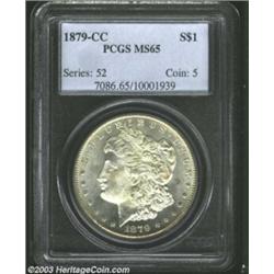 <TR><TD width="100%"><TABLE cellSpacing=1 cellPadding=3 width="100%" border=0><TBODY><TR><TD width="100%" bgColor=#79735c><FONT face=arial color=#ffffff size=3><B>Description</B> </FONT></TD></TR><TR><TD width="100%" bgColor=#ffffff><FONT face=arial size=2><B>1879-CC $1 MS65 PCGS.</B></I> Wisps of golden-brown patina reach Liberty's cheek and the right obverse field, while the reverse has only the faintest hints of orange-gold color. A nicely struck Gem whose frosty devices deliver mild contrast with the flashy semi-prooflike fields. Aside from an unobtrusive contact mark above TRUST, the fields are beautifully preserved, and the cheek is free from the notable slide marks that trouble so many Uncirculated Morgan Dollars. Unlike other Carson City issues from the mint's first period of production, the 1879-CC did not emerge in great quantity during the GSA sales of the 1970s. </FONT></TD></TR></TBODY></TABLE></TD></TR></TBODY></TABLE><BR><A name=PricesRealized></A><TABLE cellSpacing=0 cellPadding=0 width="100%" bgColor=#000000 border=0><TBODY><TR><TD width="100%"><TABLE cellSpacing=1 cellPadding=3 width="100%" border=0><TBODY><TR><TD width="100%" bgColor=#79735c><A name=PR><FONT face=arial color=#ffffff size=3><B>Previous Prices from Heritage Auctions</B> </FONT></A></TD></TR><TR><TD bgColor=#f6f6ed><TABLE cellSpacing=0 cellPadding=0 width="100%" border=1><TBODY><TR><TD align=middle width="33%"><B>Date</B></TD><TD align=middle width="33%"><B>Service</B></TD><TD align=middle width="33%"><B>Price</B></TD></TR><TR bgColor=whitesmoke><TD width="33%"><B>09/30/2002</B></TD><TD width="33%">PCGS</TD><TD width="33%">$12,075.00</TD></TR><TR bgColor=whitesmoke><TD width="33%"><B>07/30/2002</B></TD><TD width="33%">PCGS</TD><TD width="33%">$10,637.50</TD></TR><TR bgColor=whitesmoke><TD width="33%"><B>05/31/2001</B></TD><TD width="33%">PCGS</TD><TD width="33%">$13,800.00</TD></TR><TR bgColor=whitesmoke><TD width="33%"><B>05/01/1999</B></TD><TD width="33%">PCGS</TD><TD width="33%">$12,650.00</TD></TR><TR bgColor=whitesmoke><TD width="33%"><B>11/01/1999</B></TD><TD width="33%">PCGS</TD><TD width="33%">$9,900.00</TD></TR><TR bgColor=whitesmoke><TD width="33%"><B>11/01/1999</B></TD><TD width="33%">PCGS</TD><TD width="33%">$13,800.00</TD></TR><TR bgColor=whitesmoke><TD width="33%"><B>01/01/1999</B></TD><TD width="33%">PCGS</TD><TD width="33%">$12,075.00</TD></TR><TR bgColor=whitesmoke><TD width="33%"><B>08/07/1998</B></TD><TD width="33%">PCGS</TD><TD width="33%">$14,662.50</TD></TR><TR bgColor=whitesmoke><TD width="33%"><B>09/13/1997</B></TD><TD width="33%">PCGS</TD><TD width="33%">$12,075.00</TD></TR><TR bgColor=whitesmoke><TD width="33%"><B>11/23/2002</B></TD><TD width="33%">NGC</TD><TD width="33%">$10,396.00</TD></TR><TR bgColor=whitesmoke><TD width="33%"><B>04/27/2002</B></TD><TD width="33%">NGC</TD><TD width="33%">$10,350.00</TD></TR><TR bgColor=whitesmoke><TD width="33%"><B>09/01/1999</B></TD><TD width="33%">NGC</TD><TD width="33%">$13,800.00</TD></TR></TBODY></TABLE></TD></TR><TR><TD bgColor=#ffffff><FONT face=arial size=1 ?>PLEASE NOTE: All prices realized reflect the final hammer price PLUS the buyer's premium in auctions that charge a buyer's premium. Each item has a notation at the top of the listing indicating whether that lot included a buyer's premium. Example: A item that sells with a final hammer price of $100 and a 20% buyer's premium will display with a price realized of $120. All information listed is intended to be as accurate as possible, but errors are possible. Please use this guide carefully and inform us of any inaccuracies. </FONT></TD></TR></TBODY></TABLE></TD></TR></TBODY></TABLE><BR><TABLE cellSpacing=0 cellPadding=0 width="100%" bgColor=#000000 border=0><TBODY><TR><TD width="100%"><TABLE cellSpacing=1 cellPadding=3 width="100%" border=0><TBODY><TR><TD width="100%" bgColor=#79735c colSpan=6><FONT face=arial color=#ffffff size=3><B>Price Guide*</B> </FONT></TD></TR><TR bgColor=#f6f6ed><TD align=middle><B>Grade</B> </TD><TD align=middle><B>Coin World<BR>(Trends)</B> </TD><TD align=middle><B>Numismedia<BR>Retail</B> </TD><TD align=middle><B>Numismedia<BR>Wholesale</B> </TD><TD align=middle><B>Coin<BR>Universe</B> </TD><TD align=middle><B>Heritage<BR>Value Index</B> </TD></TR><TR bgColor=#ffffff><TD align=middle>64</TD><TD align=right>$5,200.00</TD><TD align=right>---</TD><TD align=right>$4,450.00</TD><TD align=right>$6,100.00</TD><TD align=right>$4,259.38</TD></TR><TR style="FONT-WEIGHT: bold" bgColor=#cccfdd><TD align=middle>65</TD><TD align=right>$17,250.00</TD><TD align=right>---</TD><TD align=right>$13,250.00</TD><TD align=right>$19,000.00</TD><TD align=right>$12,948.75</TD></TR><TR bgColor=#ffffff><TD align=middle>66</TD><TD align=right>---</TD><TD align=right>---</TD><TD align=right>$35,000.00</TD><TD align=right>$45,000.00</TD><TD align=right>$31,950.00</TD></TR><TR bgColor=#ffffff><TD colSpan=6><FONT size=1>*All information listed is intended to be as accurate as possible, but errors are possible. No item may be returned or refused based on this information which is provided as a service to our customers. You should contact each pricing source directly to determine the accuracy of this information. </FONT></TD></TR></TBODY></TABLE></TD></TR></TBODY></TABLE><BR><TABLE cellSpacing=0 cellPadding=0 width="100%" bgColor=#000000 border=0><TBODY><TR><TD width="100%"><TABLE cellSpacing=1 cellPadding=3 width="100%" border=0><TBODY><TR><TD width="100%" bgColor=#79735c><FONT face=arial color=#ffffff size=3><B>Population Guide</B> </FONT></TD></TR><TR bgColor=#ffffff><TD align=middle><!-- Begin Output of Population Grid--><TABLE cellSpacing=0 cellPadding=0 width="100%" border=0><TBODY><TR><TD vAlign=center><TABLE cellSpacing=0 width="100%" border=1 cellsadding="3"><TBODY><TR><TD vAlign=center><TABLE cellSpacing=0 cellPadding=3 width="100%" border=1><TBODY><TR><TD vAlign=center align=middle bgColor=#f0f1e8 colSpan=2 <CENTER><FONT face=Arial size=2><B>PCGS Pop </B></FONT><CENTER></CENTER>