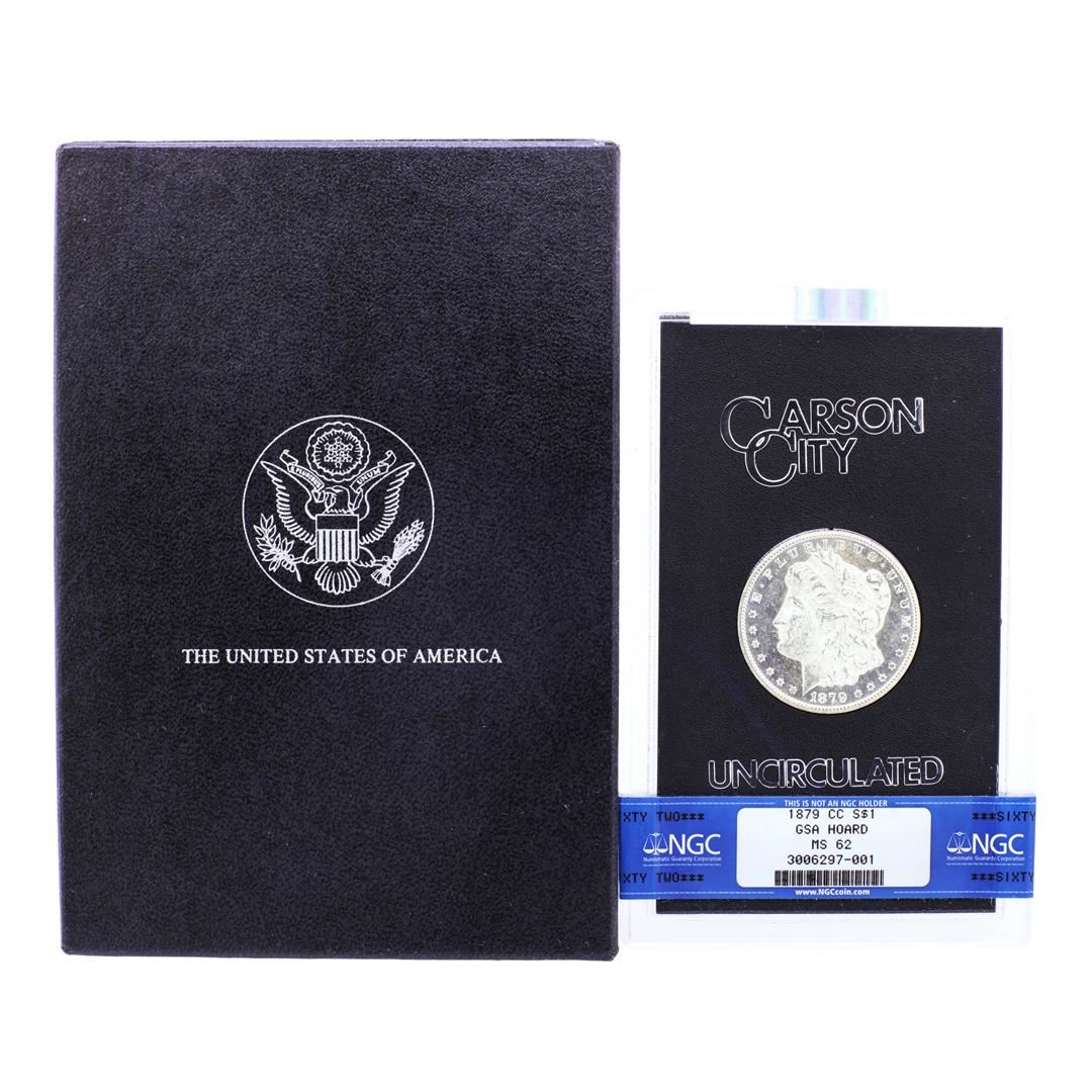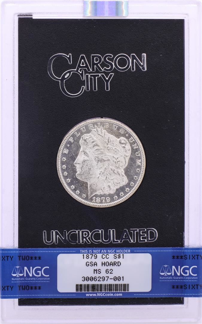 One 1879-CC $1 Morgan Silver Dollar Coin GSA Hoard Uncirculated NGC MS62 w/Box. NGC Certified.
