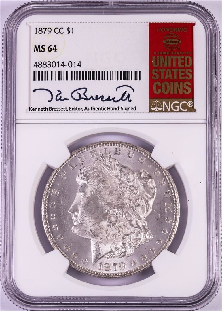 One 1879-CC $1 Morgan Silver Dollar Coin NGC MS64 Kenneth Bressett Signature. NGC Certified.