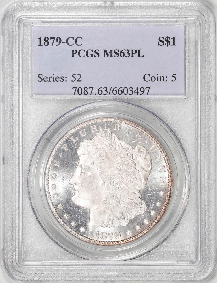 One 1879-CC $1 Morgan Silver Dollar Coin PCGS MS63PL. PCGS Graded.