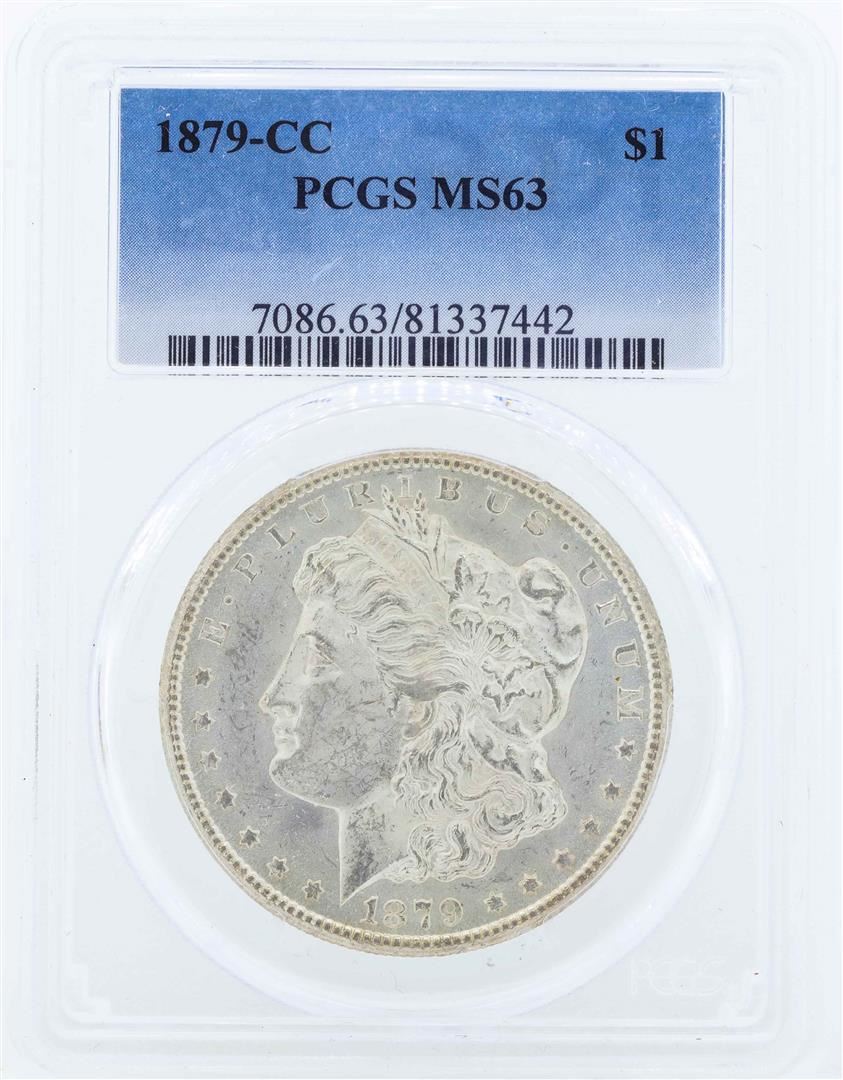 One 1879-CC $1 Morgan Silver Dollar Coin PCGS MS63. PCGS Graded.