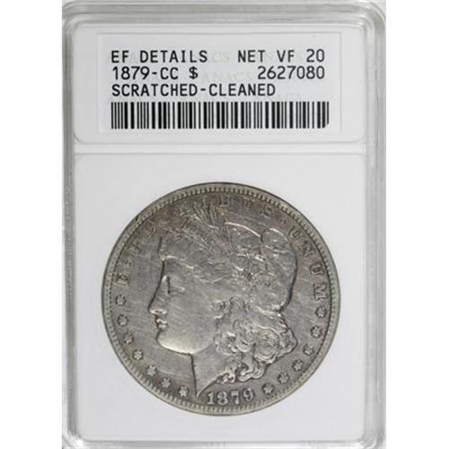 <B>1879-CC $1 --Cleaned, Scratched--ANACS. XF Details Net VF20.</B></I> NGC Census: (14/1256). PCGS Population (42/2397). Mintage: 756,000. Numismedia Wsl. Price for NGC/PCGS coin in VF20: $217. (#7086)<BR><BR><B>Coin Engraver:</B> George T. Morgan<BR><BR><b>Shipping:</b> Coins & Currency (<a target="_blank" href="http://www.heritageauctions.com/common/shipping.php">view shipping information</a>\)
