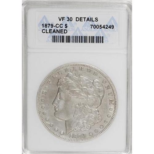 <B>1879-CC $1 --Cleaned--ANACS. VF30 Details.</B></I> NGC Census: (32/1253). PCGS Population (70/2402). Mintage: 756,000. Numismedia Wsl. Price for NGC/PCGS coin in VF30: $350. (#7086)<BR><BR><B>Coin Engraver:</B> George T. Morgan<BR><BR><b>Shipping:</b> Coins & Currency (<a target="_blank" href="http://www.heritageauctions.com/common/shipping.php">view shipping information</a>)
