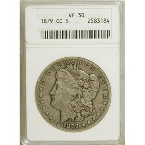 <B>1879-CC $1 VF30 ANACS.</B></I> NGC Census: (35/1292). PCGS Population (72/2474). Mintage: 756,000. Numismedia Wsl. Price for NGC/PCGS coin in VF30: $356. (#7086)<BR><BR><B>Coin Engraver:</B> George T. Morgan<BR><BR><b>Shipping:</b> Coins & Currency (<a target="_blank" href="http://www.heritageauctions.com/common/shipping.php">view shipping information</a>)
