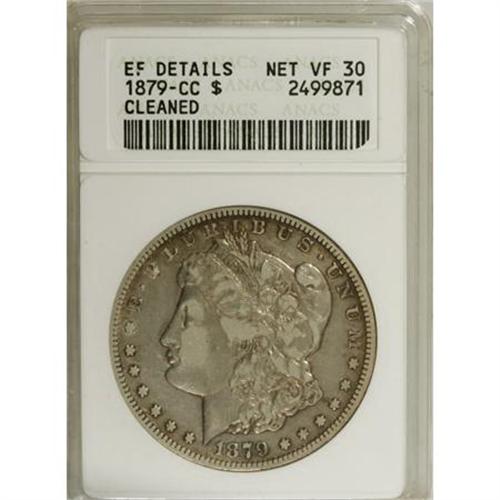 <B>1879-CC $1 --Cleaned--ANACS. XF Details. Net VF30.</B></I> NGC Census: (29/1232). PCGS Population (65/2342). Mintage: 756,000. Numismedia Wsl. Price for NGC/PCGS coin in VF30: $350. (#7086)<BR><BR><B>Coin Engraver:</B> George T. Morgan<BR><BR><b>Shipping:</b> Coins & Currency (<a target="_blank" href="http://www.heritageauctions.com/common/shipping.php">view shipping information</a>)