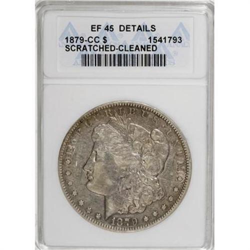 <B>1879-CC $1 --Cleaned, Scratched--ANACS. XF45 Details.</B></I> NGC Census: (91/1019). PCGS Population (81/2099). Mintage: 756,000. Numismedia Wsl. Price for NGC/PCGS coin in XF45: $839. (#7086)<BR><BR><B>Coin Engraver:</B> George T. Morgan<BR><BR><b>Shipping:</b> Coins & Currency (<a target="_blank" href="http://www.heritageauctions.com/common/shipping.php">view shipping information</a>)
