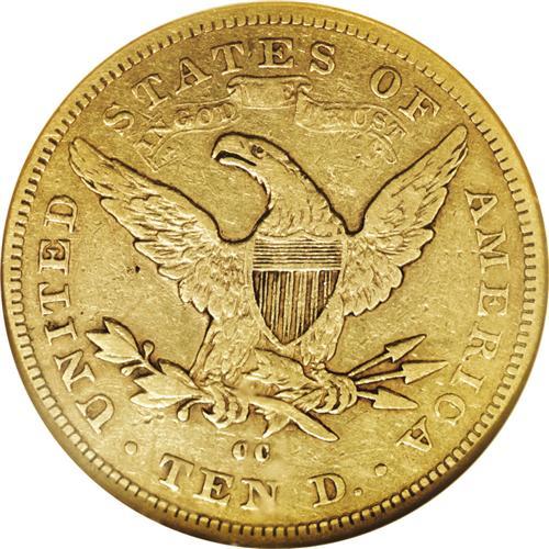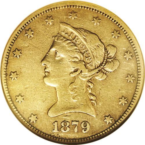 <B>1879-CC<$10> VF35 NGC.</B></I> Variety 1-A, the only known die pairing for this year. This is the rarest Carson City eagle save for the legendary 1870-CC. The Carson City, Nevada mint's output for this issue was only 1,762 pieces--the lowest ever for any CC-mint gold coin. This attractive bronze-gold example shows the moderate wear expected, but no overly distracting abrasions are apparent. Some faded luster still clings to the glinty surfaces that probably were quite prooflike when this coin was struck.<BR><I>From The Steve Glenn Collection.</B></I> <BR><BR><B>Important notice:</B> Heritage usually auctions material at the rate of 200-250 lots per hour. On some occasions eBay Live bid software or the Internet may not be able to keep up with the pace of the auction. We recommend placing a realistic absentee bid now as insurance to avoid disappointment. Occasionally the auctioneer may eliminate or reject an eBay Live bid, and the auctioneer may also reopen a lot after the close of the eBay live bidding (usually because we missed an audience bid), and may reject your bid even if it shows you as the winning bidder. By bidding via eBay Live, you agree that Heritage may award the lot to another bidder at its sole discretion under the circumstances described above or any other reasonable circumstances. Since eBay bids are not shown to us until we open the lot on the floor, we treat those bids just like floor bids. In most cases the floor responds before the eBay bid is presented to us, due to Internet lag time, so for consistency we have made it a policy that floor bids are always considered first over tie eBay live bids. Also please note that all Heritage lots purchased through eBay Live carry a 20% Buyer's Premium. Please make sure you read the Terms and Conditions before you bid. This lot is being auctioned in conjunction with a live floor auction by Heritage Galleries & Auctioneers. All final auction and invoice information will be supplied by Heritage Galleries & Auctioneers, and all other information should be considered preliminary. Lot:3984 <BR><BR><B>Winning Notification and Billing:</B> After the FINAL session in this auction is complete, Heritage will send e-mail and snail mail invoices. This process normally takes several days. All final auction and invoice information will be supplied by Heritage Galleries & Auctioneers, and all other information should be considered preliminary. <BR><BR>This auction will be conducted on a live auction floor and over the Internet through eBay Live. If you choose to place an absentee bid, please take a moment to <font color='#0000ff'><u><a href='http://pages.ebay.com/liveauctions/help/before/laabsentee.html'>learn how eBay Live absentee bidding works</a></u></font><font color='#000000'>