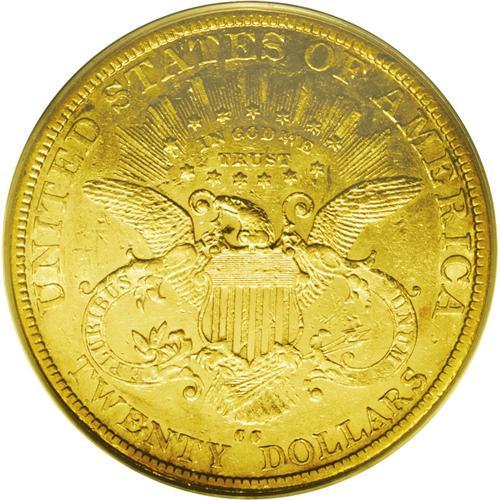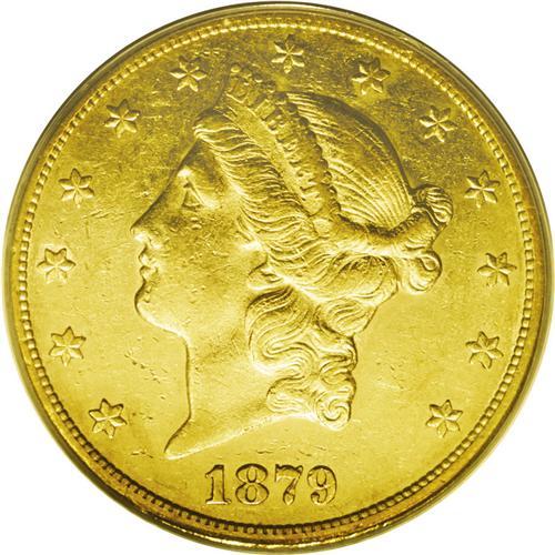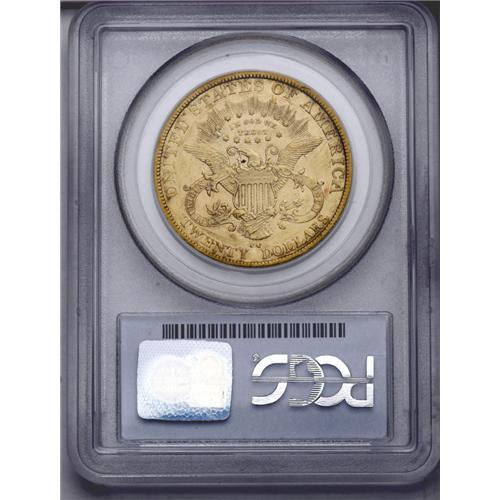 <B>1879-CC<$20> AU53 PCGS.</B></I> Variety 1-A, the only known dies. The khaki-gold centers meld into deeper reddish-gold at the borders of this stimulating piece. Much luster clings to the surfaces, which are largely devoid of distracting abrasions. The strike is a bit soft on the upper edge of the coronet and the back curls, and a small grease strike-through is noted below the eagle's neck. Population: 17 in 53, 38 finer (5/06).<BR><I>From The Guadalupe Collection, Part Two.</B></I>