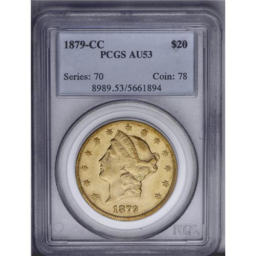 1879-CC $20 AU53 PCGS. Variety 1-A, the only known die