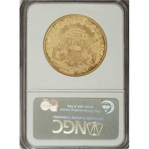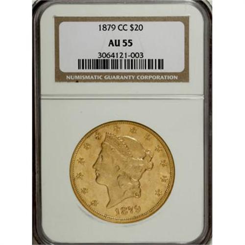 <B>1879-CC $20 AU55 NGC.</B></I> The 1879-CC double eagle has one of the lower-mintage figures for coins produced at the Carson City Mint (10,708 pieces). Choice and high-end AU examples are the best most collectors can expect to acquire, as Mint State coins are elusive; NGC and PCGS have graded only about 15 such coins, none higher than MS62 (7/07).<BR> This is a particularly nice and flashy Choice AU coin that we offer in the present lot. The fields yield a prooflike appearance, and establish nice contrast with the lightly frosted motifs that is evident from all angles of observation. The design elements are sharply delineated, including most of Liberty's hair strands and the eagle's plumage. A few small obverse contact marks are visible, though these are not as numerous or severe as would be expected for the date.<BR><BR> <BR><BR><B>Coin Engraver:</B> James B. Longacre<BR><BR><b>Shipping:</b> Coins & Currency (<a target="_blank" href="http://www.heritageauctions.com/common/shipping.php">view shipping information</a>\)