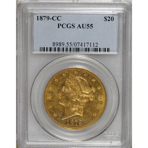 <B>1879-CC $20 AU55 PCGS.</B></I> Variety 1-A, the only known dies. One of just 10,708 pieces struck, this is a conditionally scarce issue that remains a great rarity in Mint State; this pleasing Choice AU coin would be much more affordable for the average collector. The flashy surfaces reveal substantial luster and rich coloration. Highpoint wear is minimal for the grade, and numerous small abrasions are located on each side.<BR><BR><b>Shipping:</b> Coins & Currency (<a target="_blank" href="http://www.heritageauctions.com/common/shipping.php">view shipping information</a>)