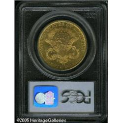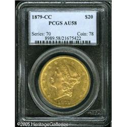 <B>1879-CC $20 AU58 PCGS.</B></I> The popularity of this low mintage Carson City Twenty, one of a mere 10,708 pieces struck, compounds the difficultly in acquiring a high-end AU example. Offered here is a boldly defined representative that retains most of its original prooflike luster and shows the typical number of surface marks. Two reeding marks on the middle of Liberty's cheek are not overtly offensive, but should distinguish this piece from similarly certified examples. Population: 6 in 58, 9 finer (1/05). Lot:9157