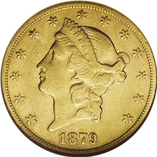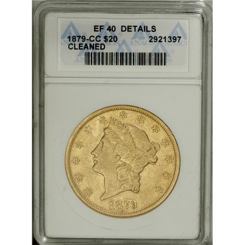 <B>1879-CC $20 --Cleaned--ANACS. XF40 Details.</B></I> Among Carson City double eagles, the 1879-CC is a much better date. Only 10,708 pieces were struck, and only a small fraction of that mintage has survived. This moderately circulated example is cloudy from cleaning, but will satisfy many CC-mint collectors.<BR><BR><b>Shipping:</b> Coin/Currency (<a target="_blank" href="http://www.heritageauctions.com/common/shipping.php">view shipping information</a>)