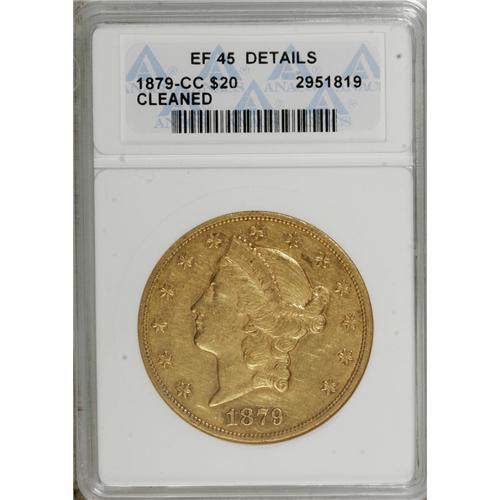 <B>1879-CC $20 --Cleaned--ANACS. XF45 Details.</B></I> This low mintage Carson City twenty is hairlined and has some granularity on the lower reverse border, but luster is extensive for the XF45 sharpness grade, and there are no heavy marks.<BR><BR><b>Shipping:</b> Coins & Currency (<a target="_blank" href="http://www.heritageauctions.com/common/shipping.php">view shipping information</a>)
