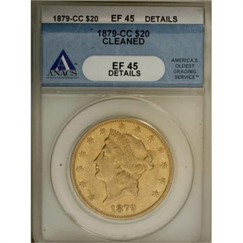 <B>1879-CC $20 --Cleaned--ANACS. XF45 Details.</B></I> Fortunately, the 1879-CC is not as scarce as its mintage of 10,708 pieces would indicate. However, examples are not usually found above the VF-XF level. This piece is slightly subdued from cleaning with small portions of mint luster remaining around the devices. Even wear over each side, and showing only small abrasions.<BR><I>Ex: Frontenac Sale (Bowers and Merena, 11/1991), lot 2330.</B></I><BR><BR><B>Coin Engraver:</B> James B. Longacre<BR><BR><b>Shipping:</b> Coins & Currency (<a target="_blank" href="http://www.heritageauctions.com/common/shipping.php">view shipping information</a>)