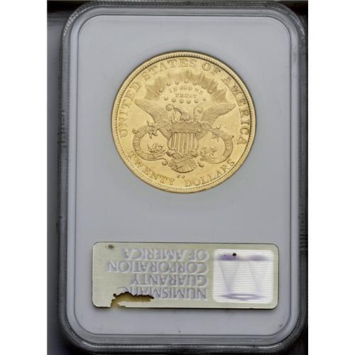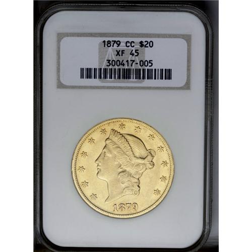 <B>1879-CC<$20> XF45 NGC.</B></I> Variety 1-A, the only known dies. Despite the low mintage of 10,708 pieces, lightly worn examples are more available than one might think, due to a hoard of XF and AU pieces discovered in Europe in the 1990s. This example has light wear that is distributed over the yellow-orange surfaces, which retain significant luster, especially on the reverse. The scattered handling marks that appear on each side have little impact on the eye appeal of this important coin.<BR><I>From The Clifton Rodenburg Collection.</B></I>