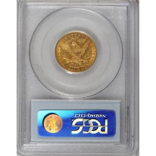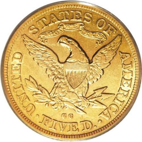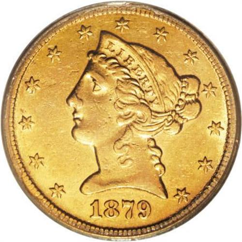 <B>1879-CC $5 AU50 PCGS.</B></I> Although half eagles were the "little sisters" of gold coinage throughout much of U.S. numismatic history, generally produced in much smaller quantities than their larger siblings, in 1879 Carson City managed to manufacture a respectable amount of five dollar pieces, 17,281, making it the third-largest mintage of the 1870s and a larger emission than the eagles and double eagles combined. This example offers only a passable strike, but there are no singular abrasions and the surfaces, with mellow orange-gold coloration, show considerable luster remaining and lots of eye appeal. A couple of tiny, undistracting planchet laminations near star 13. Population: 11 in 50, 33 finer (8/07).<BR><BR><B>Coin Engraver:</B> Christian Gobrecht<BR><BR><b>Shipping:</b> Coins & Currency (<a target="_blank" href="http://www.heritageauctions.com/common/shipping.php">view shipping information</a>)