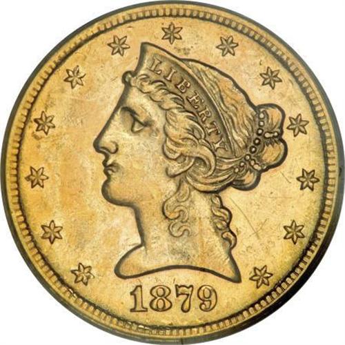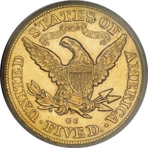 <B>1879-CC $5 AU50 PCGS.</B></I> Nearly full details are seen on both sides of this popular Carson City issue, thanks to a bold strike and less actual wear than the assigned grade would suggest. The color is a rich old-gold with just a smidgen of copper tone in the left obverse field. There is plenty of luster and the overall appeal exceeds the numerical grade.<BR><BR><B>Coin Engraver:</B> Christian Gobrecht<BR><BR><b>Shipping:</b> Coins & Currency (<a target="_blank" href="http://www.heritageauctions.com/common/shipping.php">view shipping information</a>)