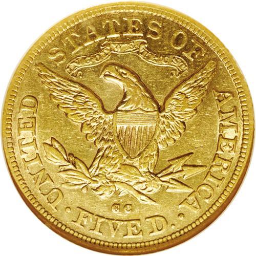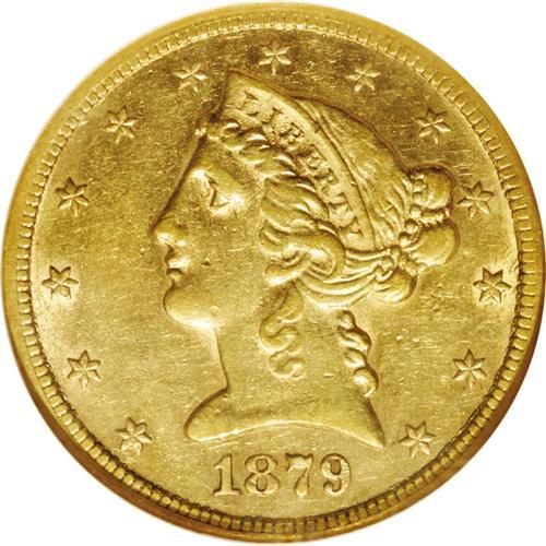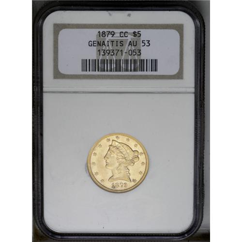 <B>1879-CC $5 AU53 NGC.</B></I> Ex: Genaitis Collection. The '79-CC is a relatively common issue in VF and XF condition. However, above that level it is a very challenging issue with only 17-22 pieces believed known in all grades of AU with a couple of Mint State coins extant. Good mint luster survives around the devices and rich orange-gold color covers each side. There is a pair of milling marks present behind the neck of Liberty and another couple of marks on the cheek.