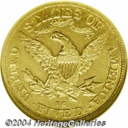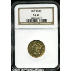 <B>1879-CC<$5> AU53 NGC.</B></I> This is an originally colored, copper-gold example whose surfaces are remarkably smooth for the grade. There is ample remaining detail and traces of mint luster in the protected areas. The 1879-CC boasts a limited original mintage of 17,281 pieces, yet the issue is more available than the other CC-mint Half Eagles struck in the 1870s. Most survivors do, however, fall into the VF grade level.<BR><I>From The Barry Donnell Collection, Part Two.</B></I> <BR><BR><B>Important notice:</B> Heritage usually auctions material at the rate of 200-250 lots per hour. On some occasions eBay Live bid software or the Internet may not be able to keep up with the pace of the auction. We recommend placing a realistic absentee bid now as insurance to avoid disappointment. Occasionally the auctioneer may eliminate or reject an eBay Live bid, and the auctioneer may also reopen a lot after the close of the eBay live bidding (usually because we missed an audience bid), and may reject your bid even if it shows you as the winning bidder. By bidding via eBay Live, you agree that Heritage may award the lot to another bidder at its sole discretion under the circumstances described above or any other reasonable circumstances. Since eBay bids are not shown to us until we open the lot on the floor, we treat those bids just like floor bids. In most cases the floor responds before the eBay bid is presented to us, due to Internet lag time, so for consistency we have made it a policy that floor bids are always considered first over tie eBay live bids. Also please note that all Heritage lots purchased through eBay Live carry a 20% Buyer's Premium. Please make sure you read the Terms and Conditions before you bid. </span></font></tr></table></td></tr></table>