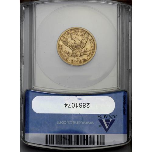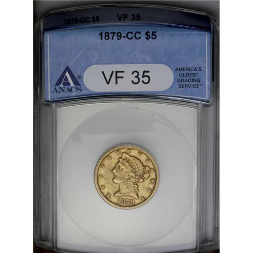<B>1879-CC<$5> VF35 ANACS.</B></I> The surfaces have subsumed to an even goldenrod on this Choice VF piece. Moderate wear is evenly distributed across the devices of this Carson City half eagle.