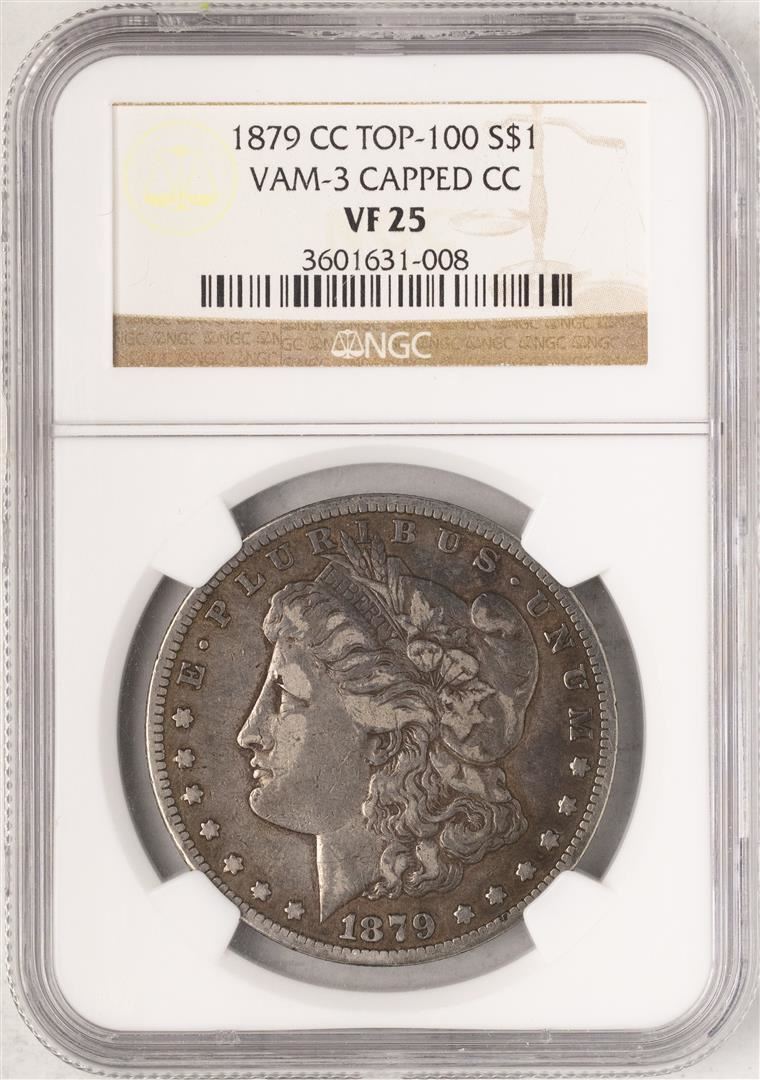 One 1879-CC Capped Die $1 Morgan Silver Dollar Coin NGC VF25. NGC Certified.