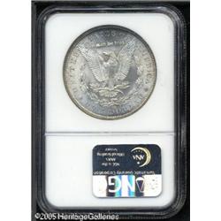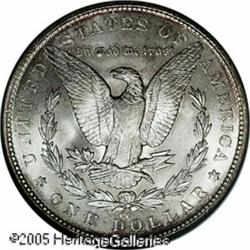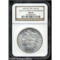 <B>1879-CC<img border='0' src='http://www.heritagecoins.com/images/star.gif' width=10 height=10>$1 Capped Die MS64 NGC.</B></I> VAM-3. Richmond Collection. One of the key dates to the Morgan dollar series and a very difficult coin to find in Choice Mint State or higher grades. This particular coin shows light gold around the edge of the obverse and extreme edge of the reverse, with the balance being bright white and lustrous. The surfaces are quite nice for an early CC Mint coin with just a few minor abrasions found with a loupe. This particular coin is identifiable by a thin reeding mark just behind the eagle's head, running close to vertical, and nearly touching the eagle's neck. A prize for the Morgan dollar specialist. Population: 106 in 64, 10 finer (1/05).<BR><I>Ex: Richmond Collection (David Lawrence Rare Coins, 11/2004), lot 1582.</B></I> Lot:9937
