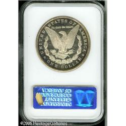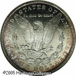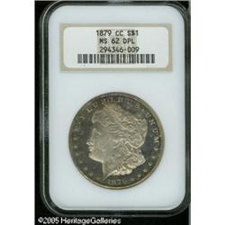 <B>1879-CC<img border='0' src='http://www.heritagecoins.com/images/star.gif' width=10 height=10>$1 MS62 Deep Mirror Prooflike NGC.</B></I> A well struck representative that has splendid contrast between the frosty devices and the highly reflective fields. The reverse is surprisingly clean for the grade, while the obverse has light luster grazes. Freckles of honey-gold and mauve patina cling to the margins. The 1879-CC is the scarcest Carson City Morgan Dollar issue from the mint's first period of production (1870 to 1885). Unlike the lower mintage 1881-CC and 1885-CC Dollars, the 1879-CC did not turn up in vast quantities in the GSA hoard. Uncirculated examples are always available for a price, but only a scant percentage of these pieces possess deeply mirrored fields. Population: 21 in 62, 41 finer (1/05). Lot:9935