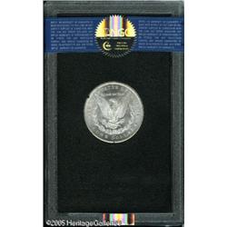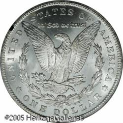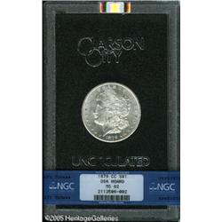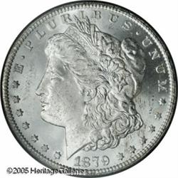 <B>1879-CC<img border='0' src='http://www.heritagecoins.com/images/star.gif' width=10 height=10>$1 MS62 NGC.</B></I> An essentially brilliant example of this rare Carson City Dollar. The strike is intricate, the luster is semi-prooflike, and the reverse is well preserved. A few small blemishes on the cheek limit the grade. Not as low mintage as the 1881-CC and 1885-CC issues, but much tougher in Mint State since comparatively few pieces emerged from the GSA hoard, most of which no longer reside in their original GSA holders. The box of issue accompanies the lot. Lot:11047