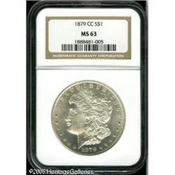 <B>1879-CC<img border='0' src='http://www.heritagecoins.com/images/star.gif' width=10 height=10>$1 MS63 NGC.</B></I> During the 1940s, 1950s, and 1960s several bags of 1879-CC dollars emerged from the Treasury Department. Most of the coins on the market today are from these several distributions over a twenty-year period. This is a brilliant example that has pleasing mint luster. Sharply defined, there are only the slightest abrasions and luster grazes present on this clean, semi-key CC issue.<BR><I>Purchased from Abner Kreisberg Corporation on September 17, 1980 for $3,750.</B></I><BR><I>From The Beverly Hills Collection.</B></I> Lot:9932