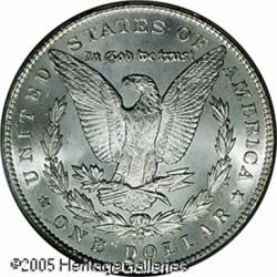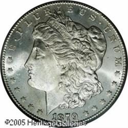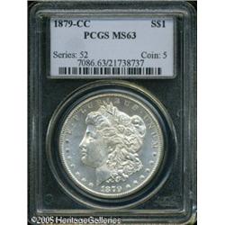 <B>1879-CC<img border='0' src='http://www.heritagecoins.com/images/star.gif' width=10 height=10>$1 MS63 PCGS.</B></I> This elusive coin is frosty and bright, with ample luster in the fields to please the eye. Close examination will note a few minor reeding marks on Liberty's nose which will serve to identify this coin. Typically well struck, and a good coin for the collector who wants an attractive uncirculated coin for their date set. A very difficult decision must be made to figure out what coin can be secured given the realities of budget limitations, and this is one of the more expensive dates to procure. Population: 579 in 63, 617 finer (1/05). Lot:9931