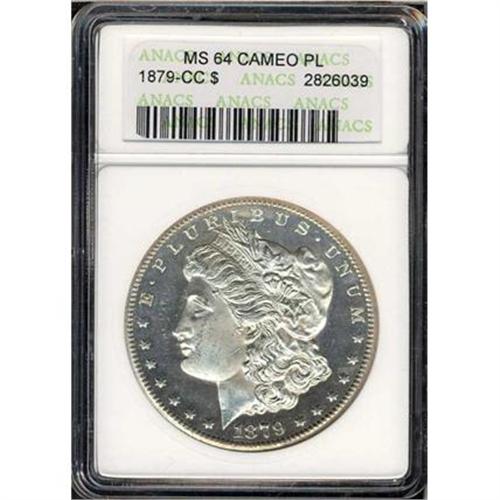 <b>1879-CC Morgan Dollar. ANACS graded MS64 Cameo Prooflike.</b> This is a lovely, radiant '79-CC, both sides being essentially untoned with frosty, silver-white luster on the main devices (Liberty, eagle, and the tops of the letters) against which are contrasting prooflike fields. And so to the next qualification, the strike. Here we see quite good detail with not even minor weakness to the sharp centers. Weakly struck 1879-CC dollars are more prevalent than those struck properly by the dies, as seen here, which is why we expect to see a lot of attention given to this specimen. A low mintage semi-key from the earliest years of the series (Morgan dollars ran from 1878 to 1921).