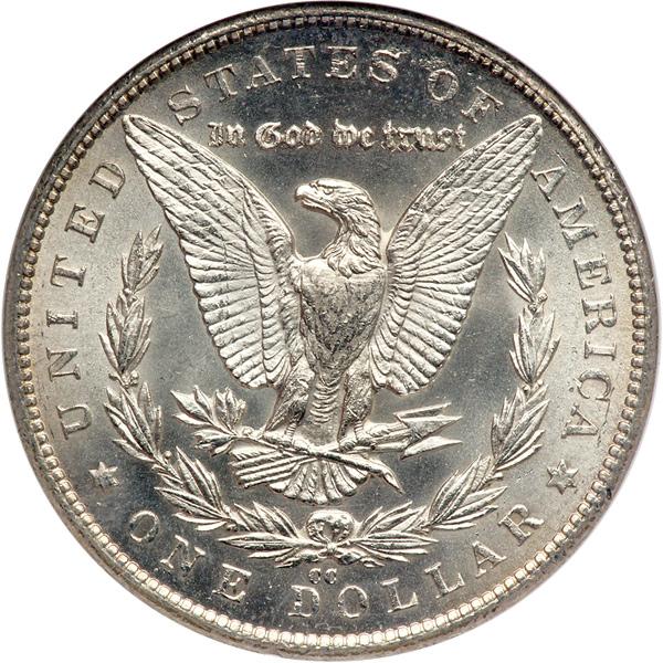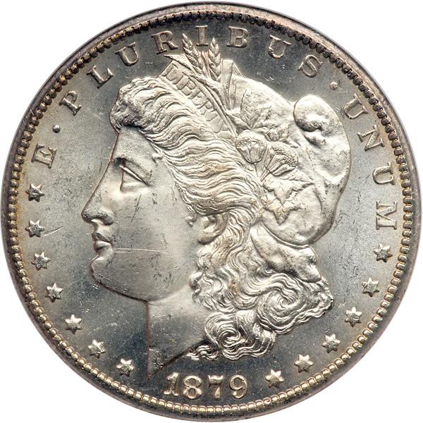 1879-CC Morgan Dollar. NGC graded MS-63 PQ. Well struck and mostly untoned. Beautifully fresh appearing with milky white devices against a mild reflective sheen on the obverse, being just enough less on the reverse to preclude the reflective designation. We do encourage bidders to study the extra sharp detail on Liberty and the eagle to familiarize yourself with how an 1879-CC should look (though often it doesn't). Clearly a very attractive specimen. You can expect many serious buyers to say to themselves "count me in" when the time for submitting bids arrives (PCGS # 7086) .