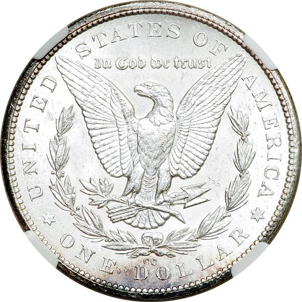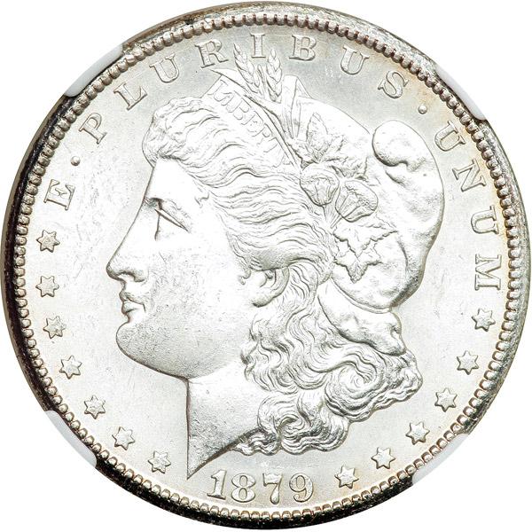 1879-CC Morgan Dollar. NGC graded MS-63. VAM-3 Capped CC Top 100. A frosty white coin. A brilliant, gleaming specimen with no visible imperfections other than some scattered bagmarks usually associated with this issue. Fine boldness of strike throughout, which further supports the desirable MS63 grade. Only 756,000 minted.