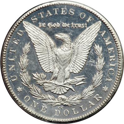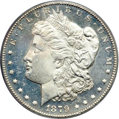 1879-CC Morgan Dollar. PCGS graded MS-63 Prooflike. Predominantly untoned with shimmering prooflike fields. Beautifully untoned with chalky white devices and a nice reflective sheen on the obverse and reverse, being just far enough along to sport the desirable Prooflike designation. We do note Liberty's cheek as being much fresher than average for a dollar grading MS63, and with fewer field marks as well. Pop 90; 68 finer, 61 in 64, 7 in 65 (PCGS # 7087) .
