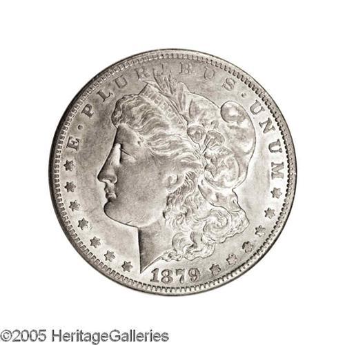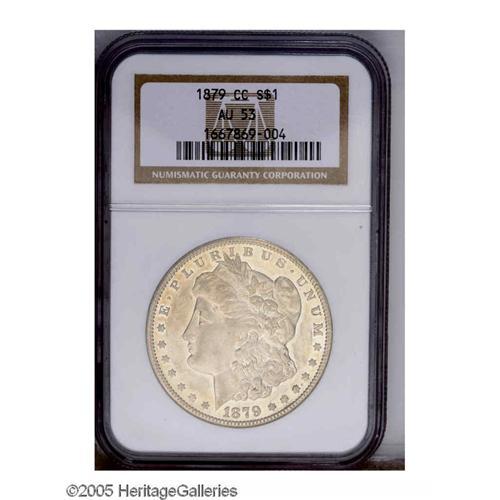 <B>1879-CC<S$1> AU53 NGC.</B></I> Normal Mintmark variety. This is an attractive example with silver-gray toning and only a light amount of wear. The '79-CC is one of the three most important Morgan Dollar issues from the Carson City Mint. Attractive AU examples are always in demand.