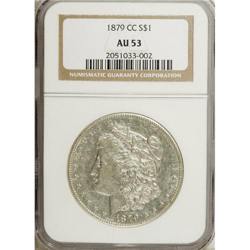 <B>1879-CC S$1 AU53 NGC.</B></I> Perfect Mintmark. This brilliant coin shows just a bit of light friction over each side. Problem-free and well defined for the grade with no mentionable defects.<BR><BR><b>Shipping:</b> Coins & Currency (<a target="_blank" href="http://www.heritageauctions.com/common/shipping.php">view shipping information</a>)