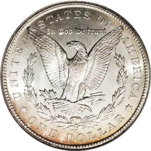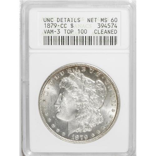 <B>1879-CC<img border='0' src='http://www.heritagecoins.com/images/star.gif' width=10 height=10>$1> Capped Die--Cleaned--ANACS. Net MS60.</B></I> VAM-3. A Top 100 Variety. Considerable hairlining can be seen, and the still-brilliant luster is only moderately impeded. A light ring of gold encircles each side, deepening on the reverse border to amber and copper hues. The surfaces show few mentionable contact marks, save for a luster graze in the left obverse field and some light ticks on Liberty's chin. This lightly cleaned example may represent good value for someone who desires a Mint State coin at perhaps a lower cost.