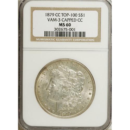 <B>1879-CC S$1 Capped Die MS60 NGC.</B></I> VAM-3. A Top 100 Variety. Moderately abraded on the obverse including a series of three evenly spaced marks on Liberty's nose. Light gray patina across both sides yields to a hint of golden color at the margins. Uncirculated 1879-CC dollars never fail to attract a slew of bidders.<BR><BR><b>Shipping:</b> Coins & Currency (<a target="_blank" href="http://www.heritageauctions.com/common/shipping.php">view shipping information</a>)