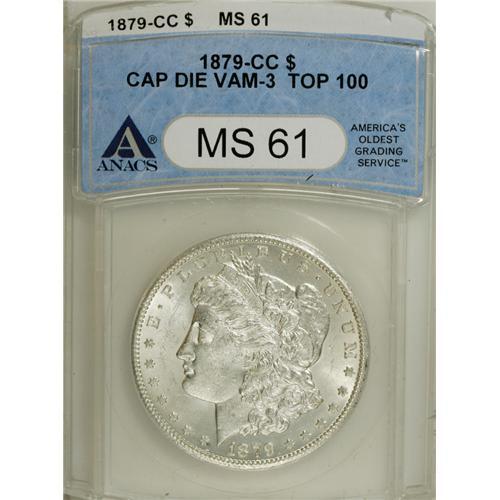 <B>1879-CC S$1 Capped Die MS61 ANACS.</B></I> VAM-3. A Top 100 Variety. The grade comprises several noticeable abrasions on Liberty's cheek and in the fields, particularly the prime focal area in front of her face. The surfaces are brilliant and untoned, however, with decent luster and a bold strike. A nice coin for the grade.<BR><BR><b>Shipping:</b> Coins & Currency (<a target="_blank" href="http://www.heritageauctions.com/common/shipping.php">view shipping information</a>)