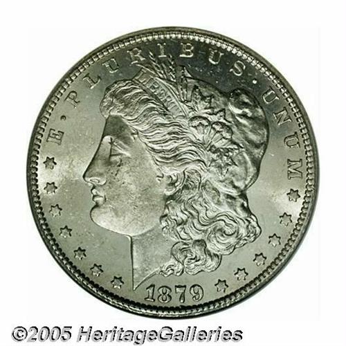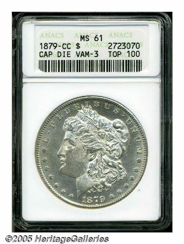 <B>1879-CC<S$1> Capped Die MS61 ANACS.</B></I> VAM-3, Top 100 Variety. Untoned with slightly subdued, satiny luster and modest facial marks that serve to limit the grade. Affordable Uncirculated quality for this popular Carson City issue.