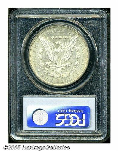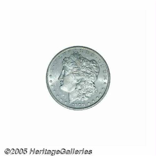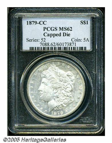<B>1879-CC<S$1> Capped Die MS62 PCGS.</B></I> VAM-3. A Top 100 Variety. Sharply struck with brilliant silver surfaces, the reverse masked by the faintest of gold toning. Both sides, and especially the obverse, have prooflike tendencies. The so-called Capped Die variety is actually a doubled mintmark variety, with a large CC beneath a smaller mintmark. The heavy marks around the mintmark area represent an attempt to hide the previous punch on the original die.